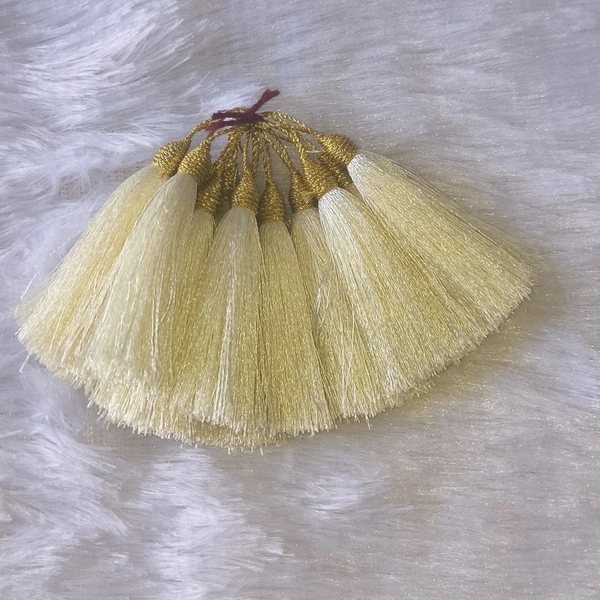Add a soft and elegant touch to your creations with these beautiful cream thread tassels. Made with silky smooth threads and a neatly wrapped golden top, these tassels offer a subtle and classy finish to any project.